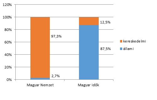 Az alábbi összehasonlítás azt mutatja, hogy a kormányközeli Magyar Idők és a kormánykritikus Magyar Nemzet között milyen jelentős különbség volt a hirdetési bevételeket tekintve 2017-ben, a Kantar Media adatai alapján. Teljesen egyértelmű, hogy a Magyar Nemzetnél alig volt állami hirdetés, míg a Magyar Időknél elsősorban az állami intézmények hirdetnek.