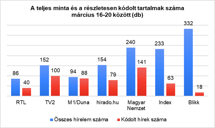 Részletesen azokat a tartalmakat kódoljuk, melyekben megjelenik magyar politikai szereplő – így a híradók esetén az adásban leadott összes hírelemhez, a hírportálokon pedig a vizsgált rovatokban (belföld, külföld, közélet, gazdaság) és a vizsgált időszakban (naponta 12 és 18 óra között) megjelent összes hírelemhez viszonyítjuk a kódolt hírek arányát.