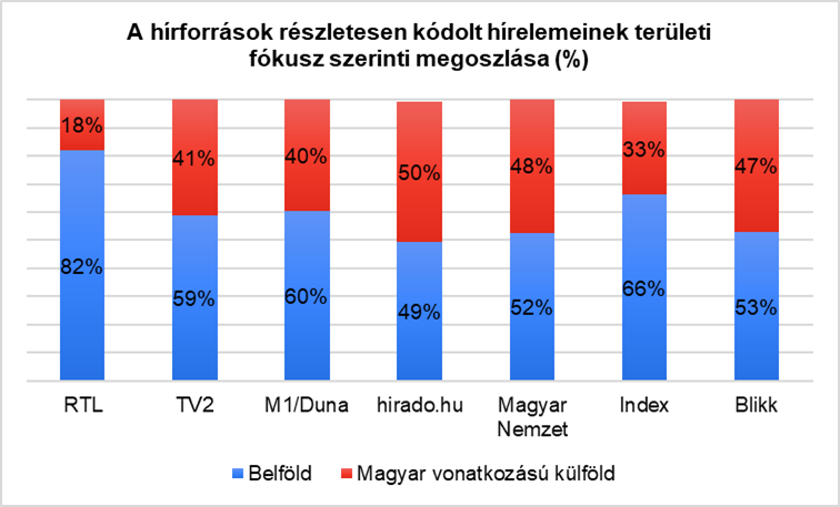 Abból kifolyólag, hogy csak azokat a tartalmakat kódoljuk, melyekben magyar politikus is megjelenik, csak belföldi és olyan külföldi fókuszú hírek kerültek a mintába, amelyeknek magyar vonatkozása van. A kormányközeli médiumok nagy arányban foglalkoznak külpolitikai kérdésekkel, mely párhuzamot mutat a kormány erősen nemzetközi kontextusba ágyazott kampánytémáival. A kormánykritikus RTL-nél jobban elválnak a kül- és belpolitikai fókuszú hírek.