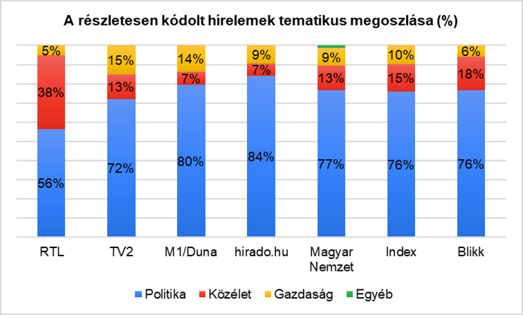 A hírelemek fő témáit tekintve is azt látjuk, hogy a kormányközeli média elsősorban a pártpolitikai témákra fókuszál, míg az RTL-en helyet kapnak tágabb értelemben vett közéleti témák is.