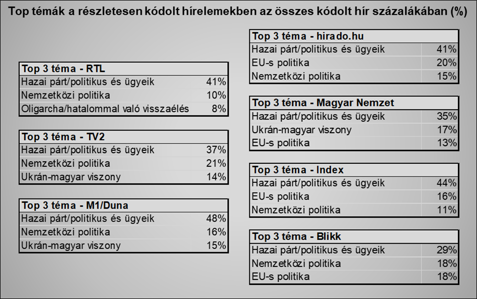 Ha megnézzük az egyes hírforrások top 3 témaköreit, szintén jól látható, hogy a nemzetközi politika jelentős arányban van jelen a vizsgált tartalmakban. Külön témaként kezeltük az EU-s politikát és a tágabb nemzetközi politikát, valamint fontosnak tartottuk, hogy a kimondottan az ukrán-magyar viszonyt tematizáló tartalmakat is elkülönítsük.