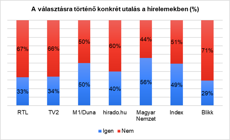 Az M1/Duna híradó, a Magyar Nemzet és az Index vizsgált híreinek kb. felében történt konkrét utalás a választásra kampányesemény beszámolók, politikusi megszólalások, választási ígéretek formájában. Legkisebb arányban a két kereskedelmi televízió híradójában és a Blikkben találkozunk konkrét választásra utaló hírekkel.