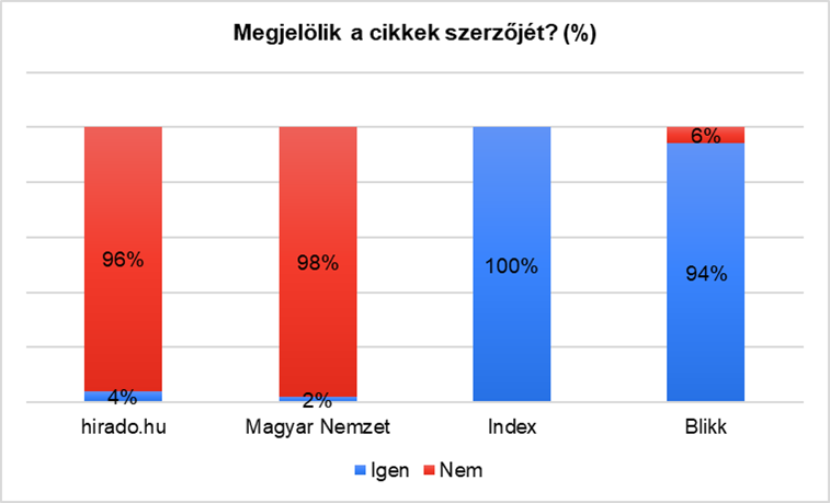 A hírportálok esetében fontos jellemzőnek tekintjük, hogy mennyire transzparensek a cikkek szerzőjének kilétét illetően. A vizsgált négy hírportálból két-két szerkesztőség igen eltérő gyakorlatokat képvisel: a hirado.hu-n és Magyar Nemzeten szinte minden tartalom szerző nélkül, míg az Indexen és a Blikken szinte mindig szerzővel publikálják az anyagokat.