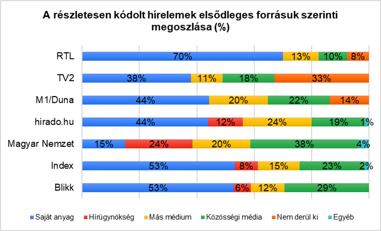 A hírelemek elsődleges forrása alapján szembeötlő különbségeket lehet felfedezni. Kimagasló például a TV2 híradójában az olyan hírek aránya, ahol nem derül ki a forrás: ez főként a kormányzati jó hírekről szóló rövid demók esetében figyelhető meg. A Szijjártó Péter által tartott sajtótájékoztatókról szóló bejátszók alapján – melyekből minden híradóban lemegy 2-3 anyag – nem egyértelmű, hogy a csatorna munkatársa maga is részt vett az eseményen, vagy esetleg hírügynökségi anyagból dolgoztak. A Magyar Nemzeten a legkisebb a saját anyagok aránya, a szerkesztőség rendszeresen közöl közösségi média bejegyzéseken alapuló vagy hírügynökségi anyagokat is.