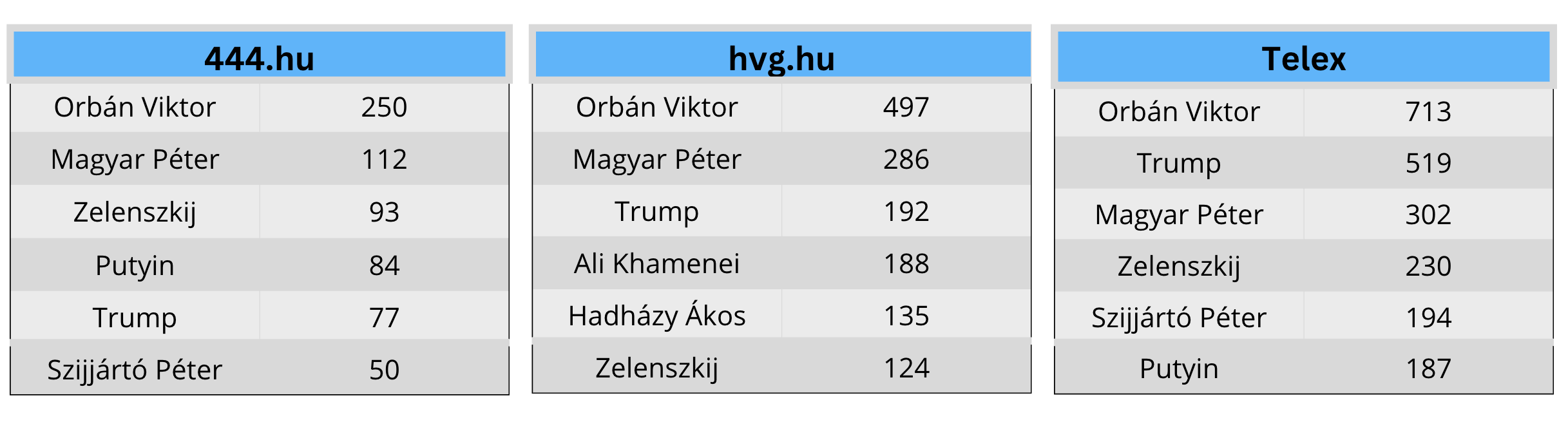 A független portálokon – a 444.hu-n, a Telexen és a hvg.hu-n – Magyar Péter megelőzi az ukrán elnököt az említési rangsorban. Ezeken az oldalakon a nemzetközi politika is hangsúlyos szerepet kap: a hvg.hu-n és a Telexen Donald Trump, Ali Khamenei volt iráni legfőbb vallási vezető, illetve Robert Fico is rendszeres szereplő, ami arra utal, hogy e portálok nagyobb teret adnak a globális összefüggések bemutatásának.