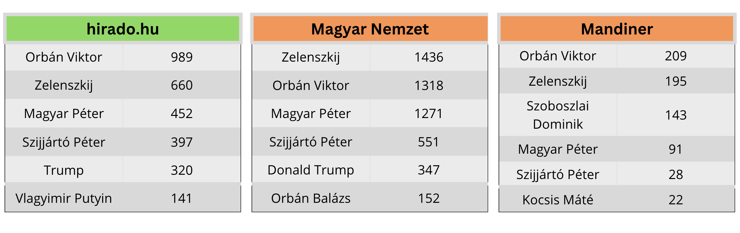 - A Magyar Nemzeten a három vezető politikus közötti számbeli különbség feltűnően kicsi. Míg a többi portálon Magyar Péter nevét nagyjából feleannyiszor írják le, mint Orbán Viktorét, a Magyar Nemzeten Zelenszkij, Orbán és Magyar Péter említéseinek száma közel azonos.