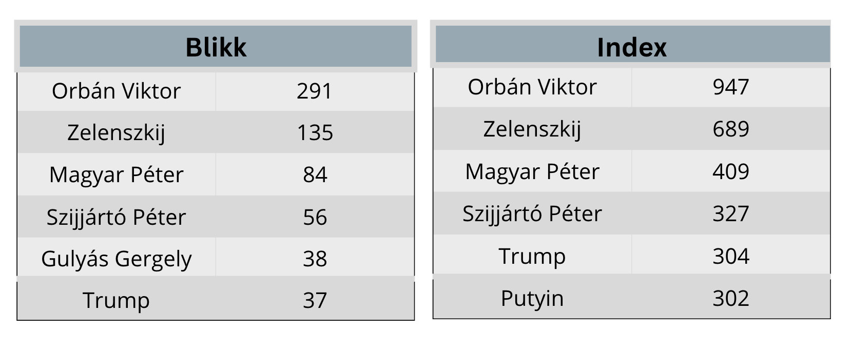 Az Indamédia két vizsgált portálján, az Indexen és a Blikken a négy legtöbbet említett politikus megegyezik, illetve Zelenszkij itt is megelőzi Magyar Pétert az említések számában.
